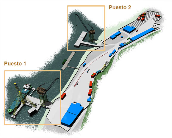 Puesto 1 2 grúas: Clyde (90 ton capacidad) Derrick (400 ton capacidad) Capacidad hasta buques con 200 mts de eslora.