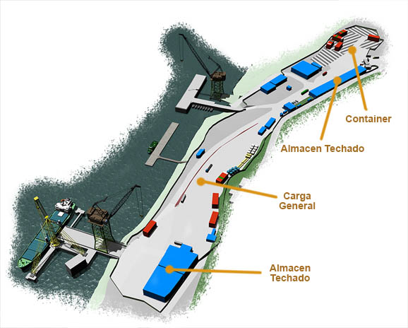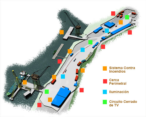 Equipos para extinción de incendios, cerca perimetral y vigilancia privada permanente con circuito cerrado de TV (CCTV) garantizando la seguridad de la carga que permanece en el muelle.